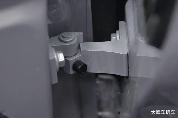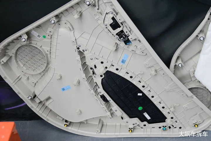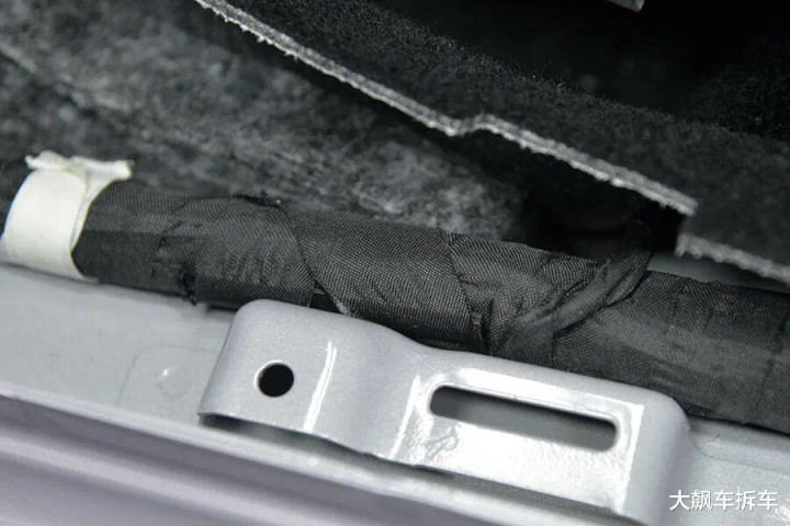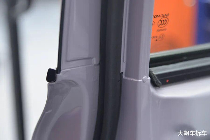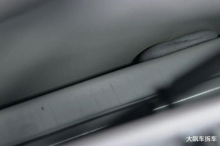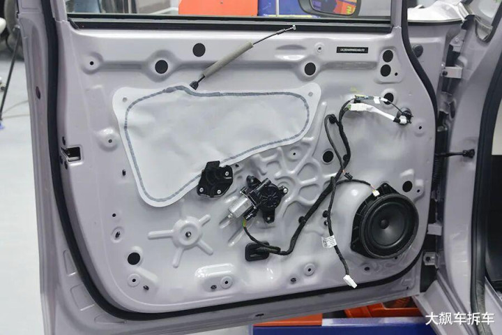 拆掉车门内饰板,看到内部采用大面积金属板,只留有检修口,使用传统的塑料膜进行防水密封,这种结构自然不会有辅助气囊更快更准弹出的门压传感器。