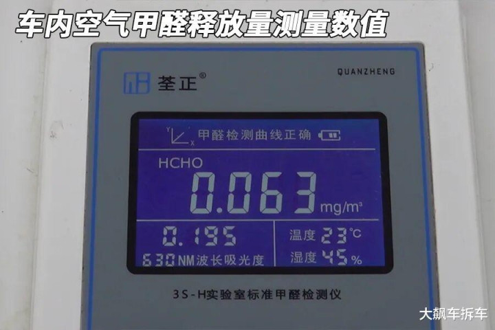 经过在23±1℃恒温环境中16小时的封闭,这辆车的车内空气甲醛释放量测量数值为0.063毫克每立方米。